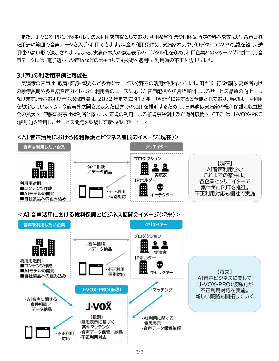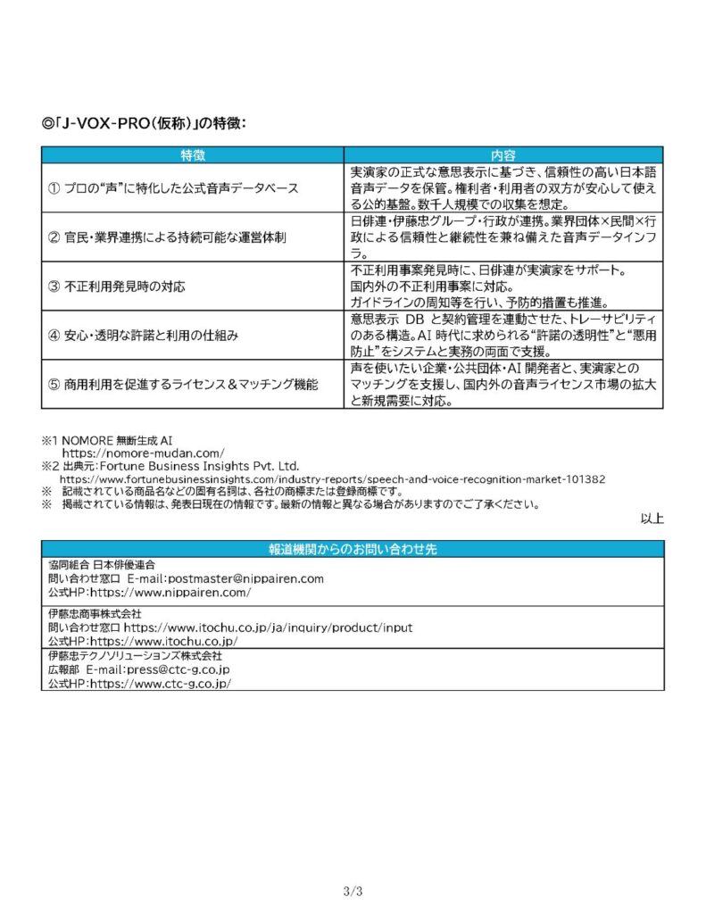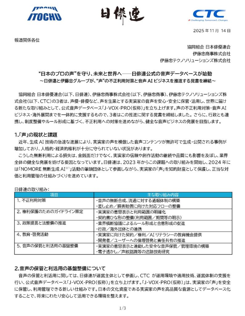 一方で、生成AIを利用した新たな分野の仕事を開拓し、世の中や実演家に貢献することを目的として、日俳連伊藤忠テクノソリューションズ株式会社、そして伊藤忠商事株式会社と連携し、本日、声のデータベース「J-VOX-PRO(仮称)を設立することといたしました。
